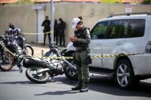 Dois policiais da Ronda Ostensiva com Apoio de Motocicletas (Rocam) ficaram feridos após uma colisão durante perseguição a suspeitos de assalto no bairro Matadouro, na zona Norte de Teresina, no final da manhã desta quarta-feira (26). Segundo o major Aquino, sub-comandante da Rocam, os policiais foram acionados por populares acerca de uma dupla realizando assaltos na região. Ao identificarem os suspeitos, deram ordem de parada e iniciaram a perseguição. “Os policiais identificaram os dois na moto e fizeram o acompanhamento. Foi dada voz de parada, eles não atenderam e durante a perseguição, no cruzamento das avenidas, houve a colisão em um veículo e em outra motocicleta”, relatou o militar. Os policiais e a condutora da motocicleta envolvida na colisão sofreram lesões leves e foram socorridos por equipes do Serviço de Atendimento Móvel de Urgência (Samu) e levados para o Hospital de Urgência de Teresina (HUT). Um dos suspeitos foi preso próximo ao local do acidente. “Ele foi pego com uma arma de fogo. Uma das vítimas compareceu ao local e apresentou uma cápsula deflagrada e fez o reconhecimento dos suspeitos”, pontuou o sub-comandante da Rocam. A perícia foi acionada e realiza procedimentos no local. O suspeito foi encaminhado para a Central de Flagrantes. Fonte: Cidade Verde / Foto: Renato Andrade/Cidadeverde.com